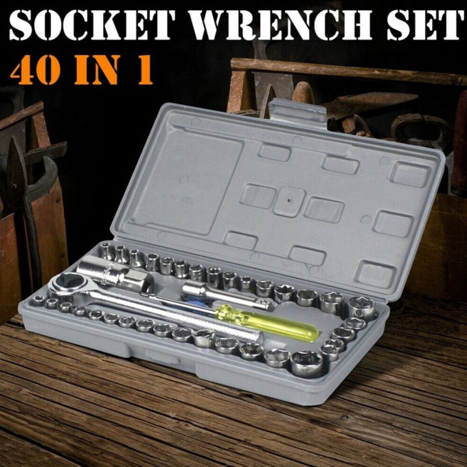 مجموعة المفاتيح والمآخذ هذه تحتوي على 40 قطعة من إنتاج علامة AIWA. وهي مخصصة لأعمال الصيانة والتصليح المتنوعة. تأتي المجموعة في علبة بلاستيكية منظمة تحتوي على: